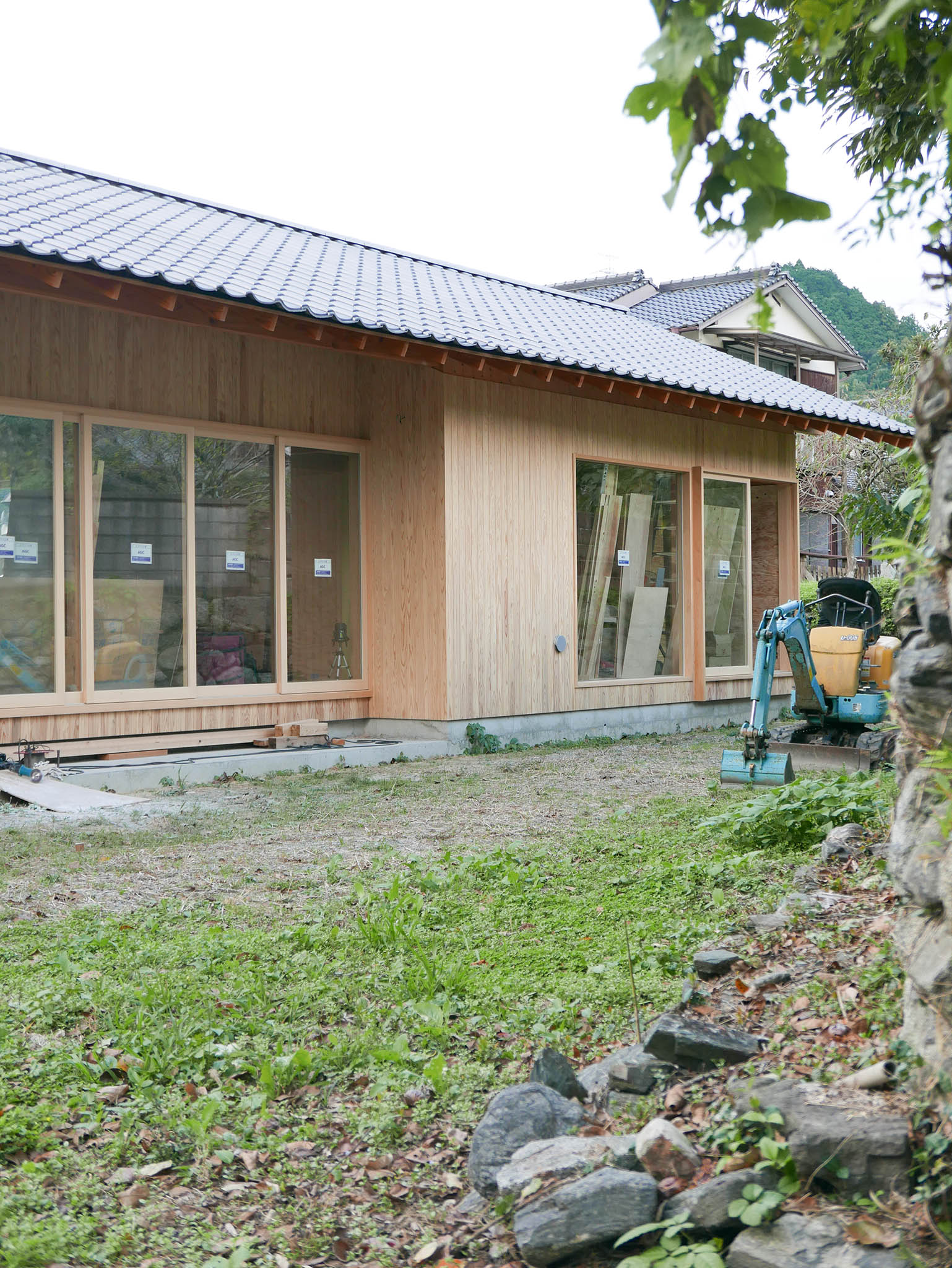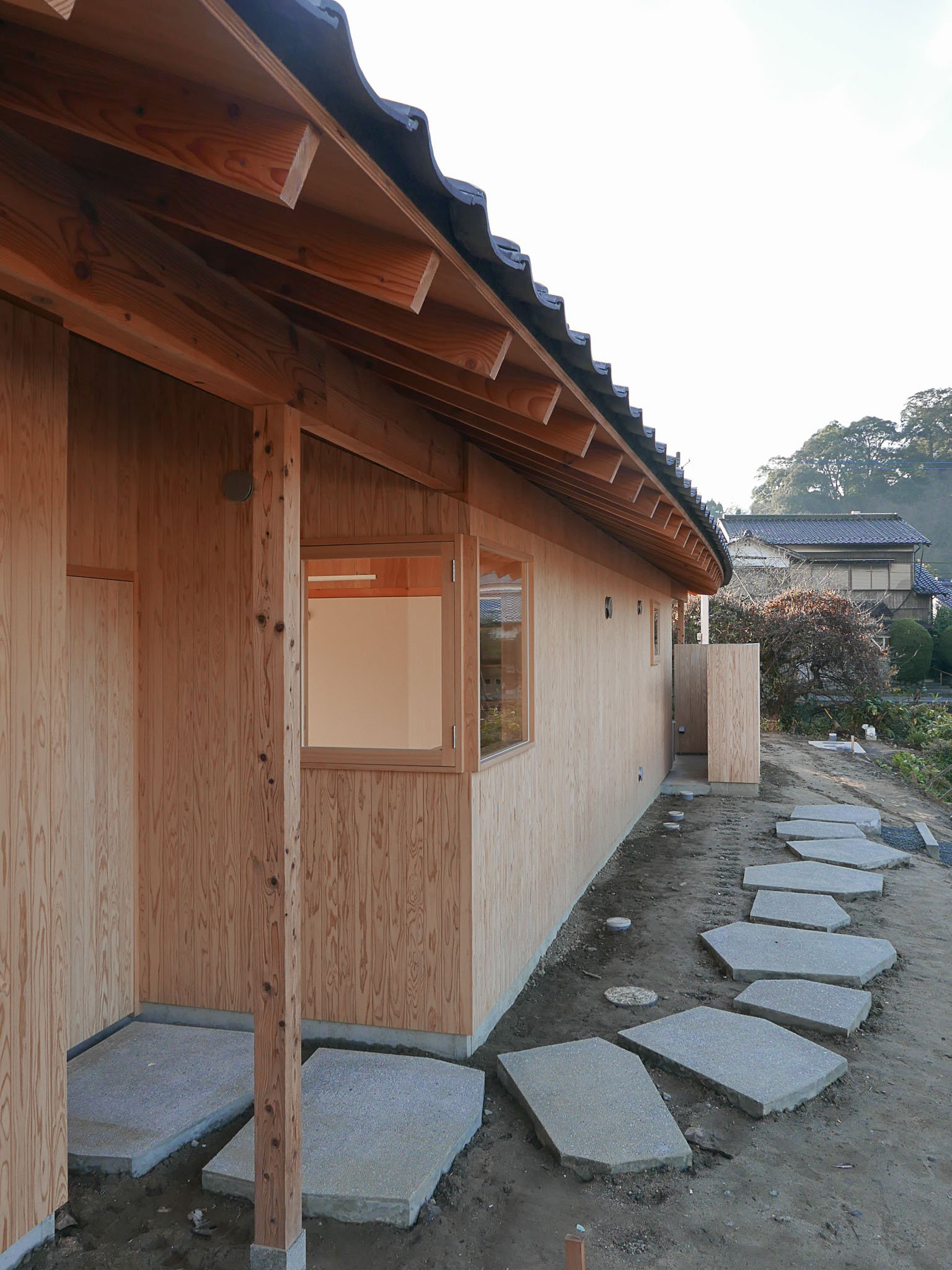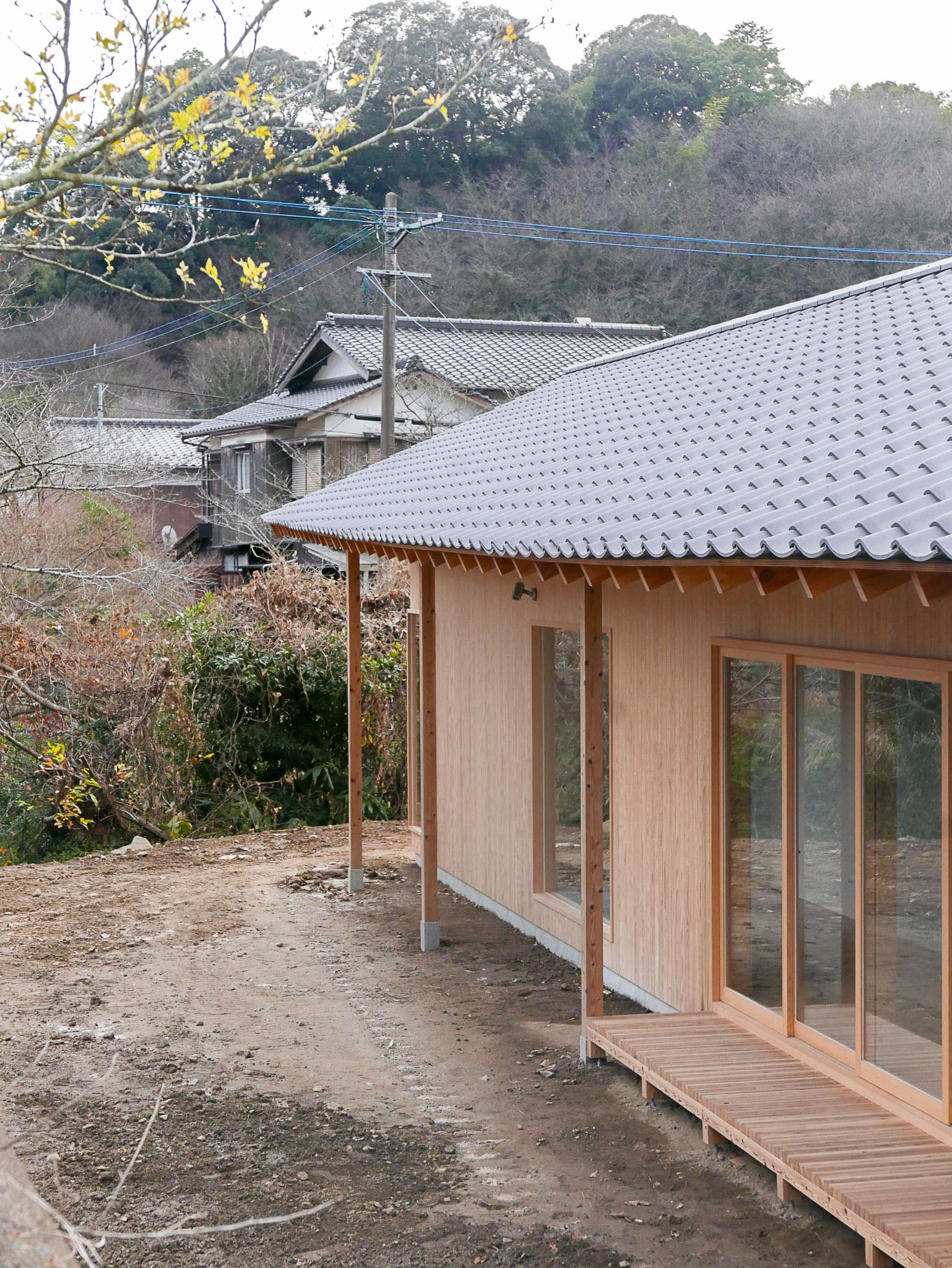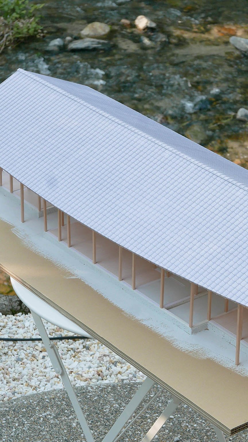 A house for a young couple with a newborn, three cats, and a dog, located beside the Notori River. The house faces southeast and follows the extended forms commonly found in the area, composed of multiple volumes arranged in a row. These are gathered under a single, gently curved roof that references the regional okiyane (raised roof) of Kyushu. Responding to local regulations governing materials, height, and roof pitch, the project seeks harmony with the townscape and natural environment of Akizuki, while making a modest attempt to explore new possibilities within a preservation area. Location: Asakura, Fukuoka, Japan Program: Family Home Year: 2024 - 2026 Floor area: 115 m2 / 35坪 Team: aki(architects) + Kuroiwa Structural Engineers Construction: Tajiri Construction Photos: aki(architects)