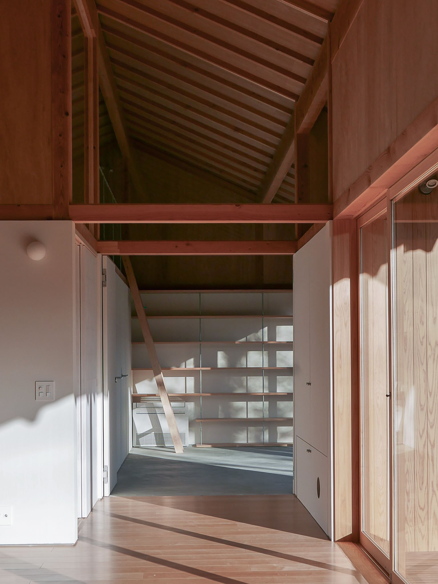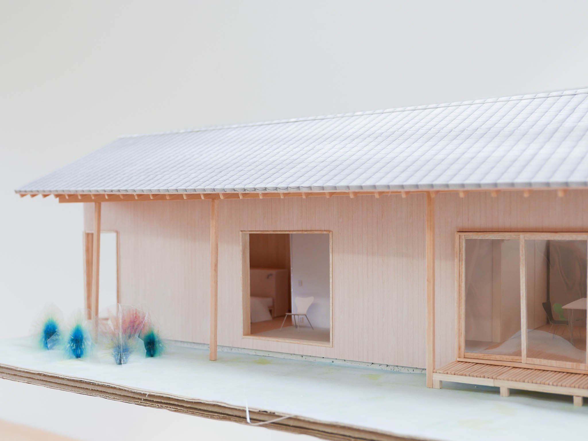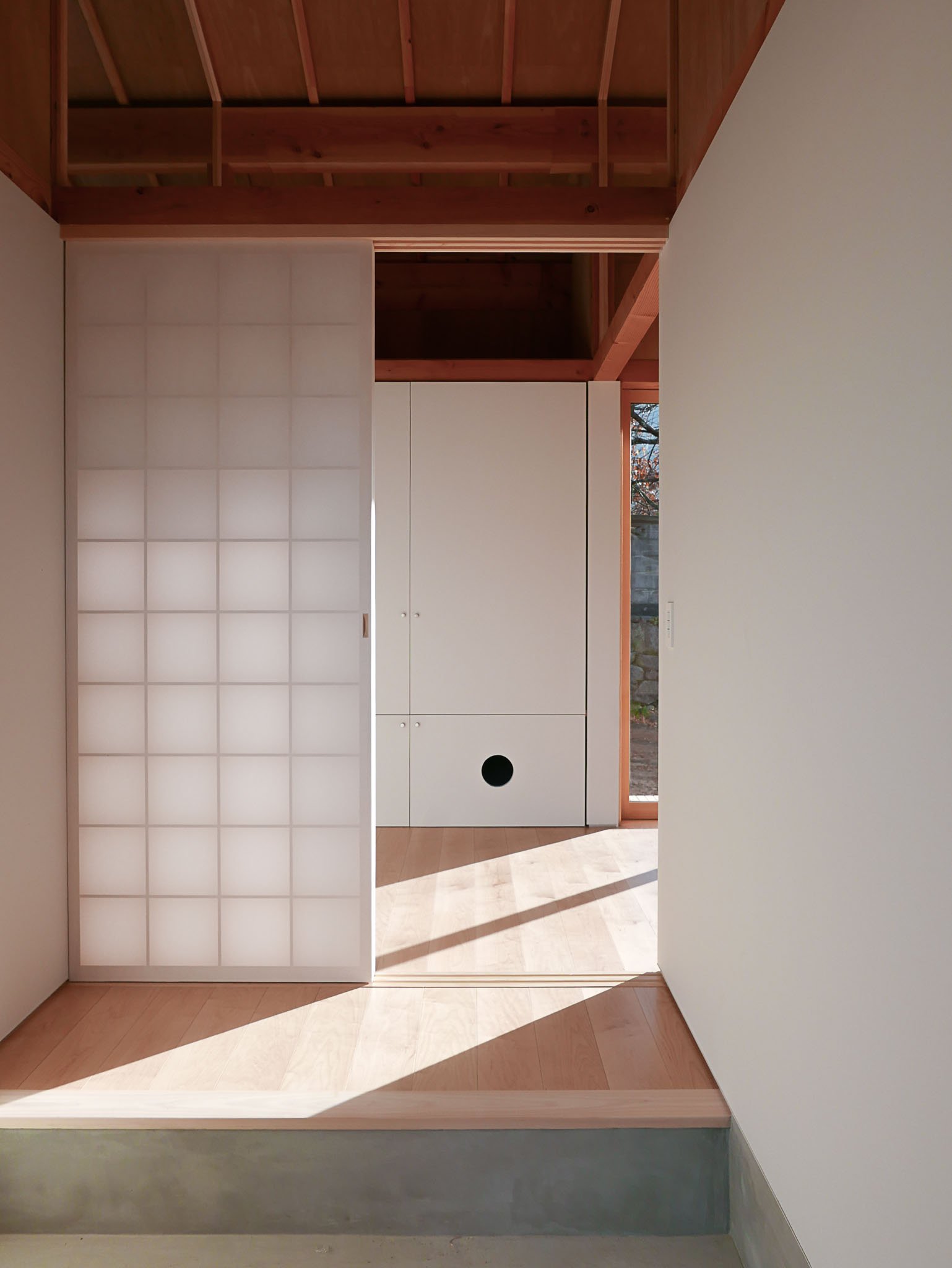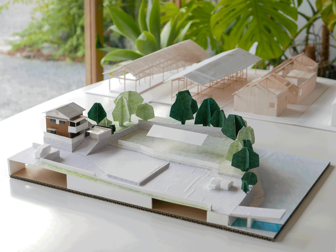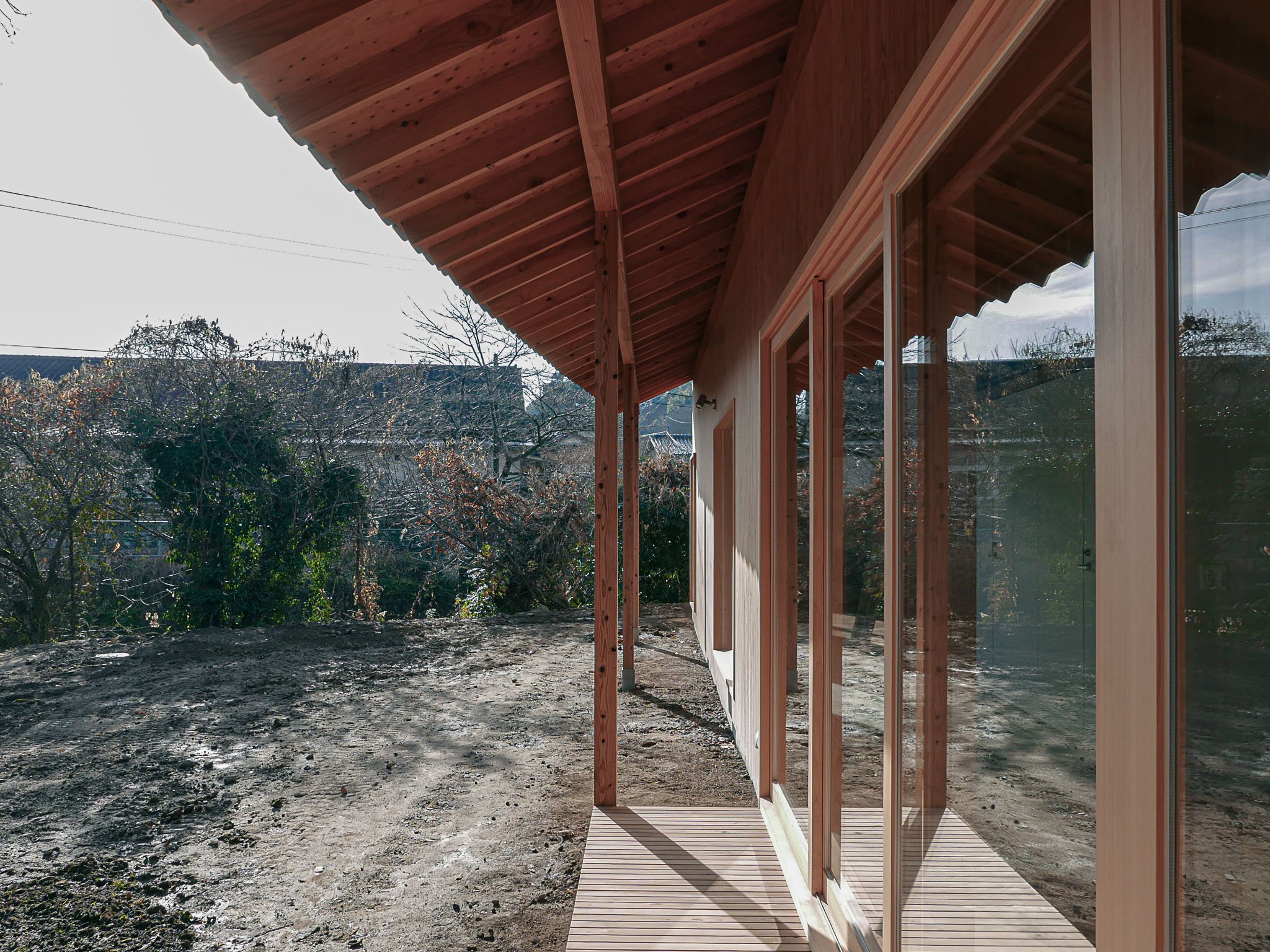 A house for a young couple with a newborn, three cats, and a dog, located beside the Notori River. The house faces southeast and follows the extended forms commonly found in the area, composed of multiple volumes arranged in a row. These are gathered under a single, gently curved roof that references the regional okiyane (raised roof) of Kyushu. Responding to local regulations governing materials, height, and roof pitch, the project seeks harmony with the townscape and natural environment of Akizuki, while making a modest attempt to explore new possibilities within a preservation area. Location: Asakura, Fukuoka, Japan Program: Family Home Year: 2024 - 2026 Floor area: 115 m2 / 35坪 Team: aki(architects) + Kuroiwa Structural Engineers Construction: Tajiri Construction Photos: aki(architects)