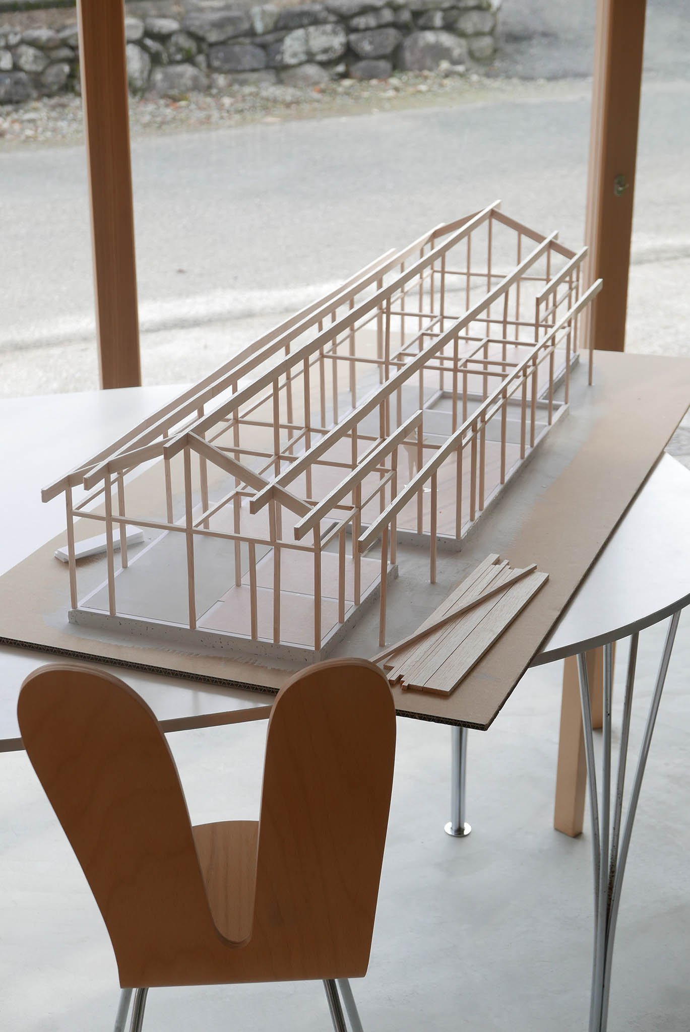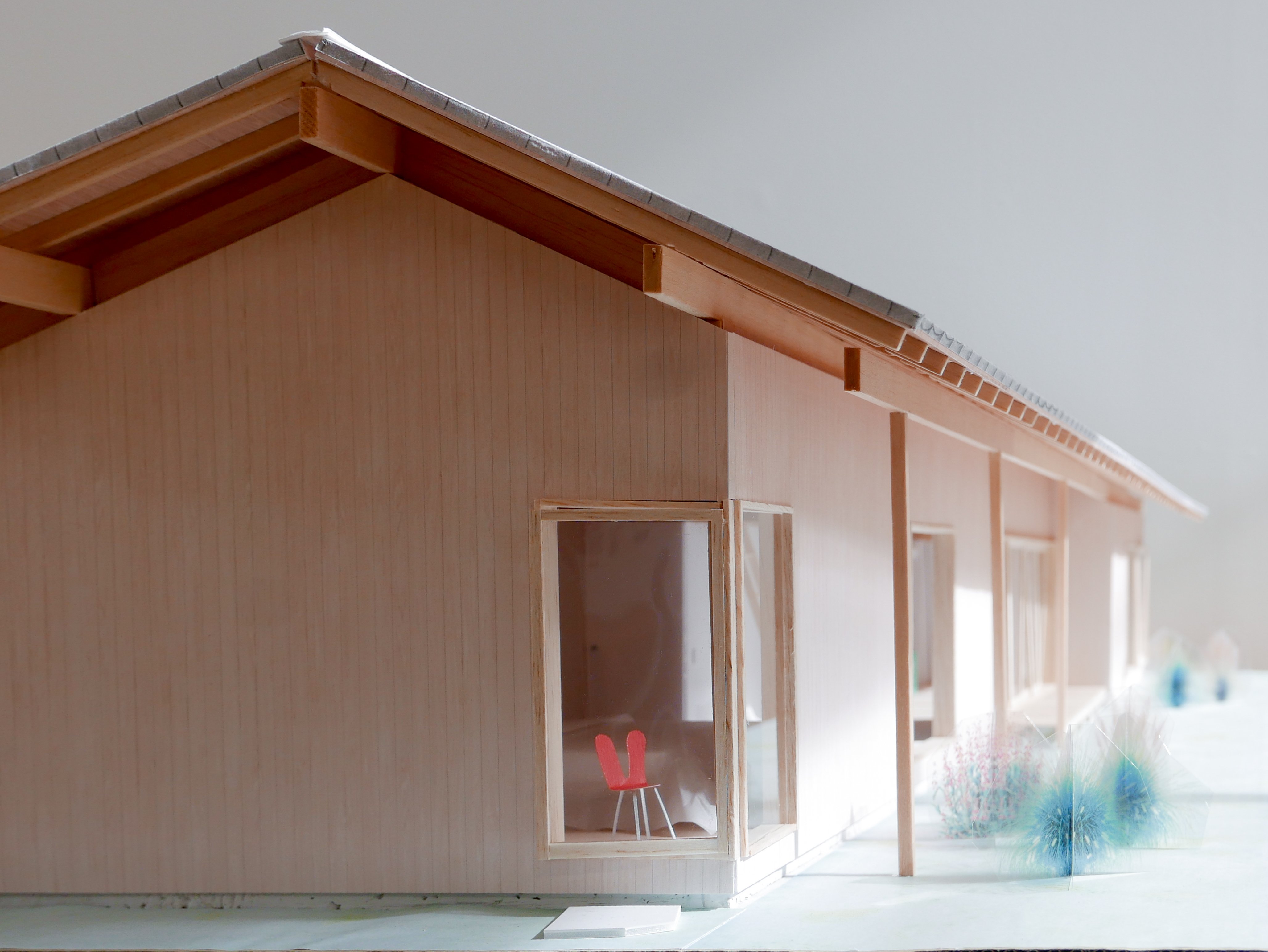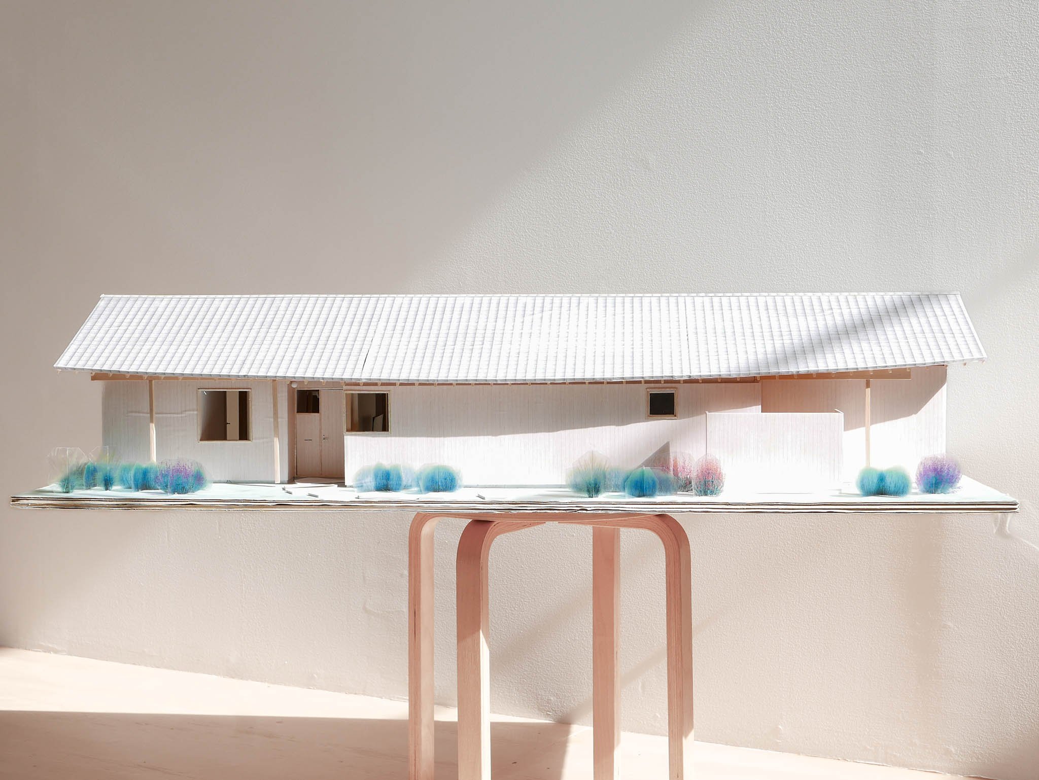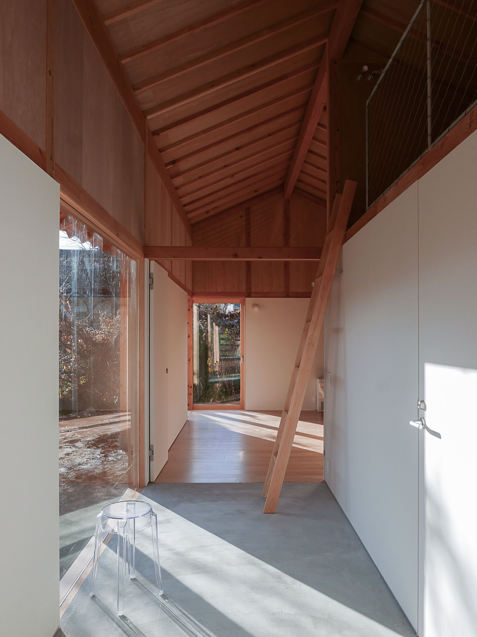 A house for a young couple with a newborn, three cats, and a dog, located beside the Notori River. The house faces southeast and follows the extended forms commonly found in the area, composed of multiple volumes arranged in a row. These are gathered under a single, gently curved roof that references the regional okiyane (raised roof) of Kyushu. Responding to local regulations governing materials, height, and roof pitch, the project seeks harmony with the townscape and natural environment of Akizuki, while making a modest attempt to explore new possibilities within a preservation area. Location: Asakura, Fukuoka, Japan Program: Family Home Year: 2024 - 2026 Floor area: 115 m2 / 35坪 Team: aki(architects) + Kuroiwa Structural Engineers Construction: Tajiri Construction Photos: aki(architects)