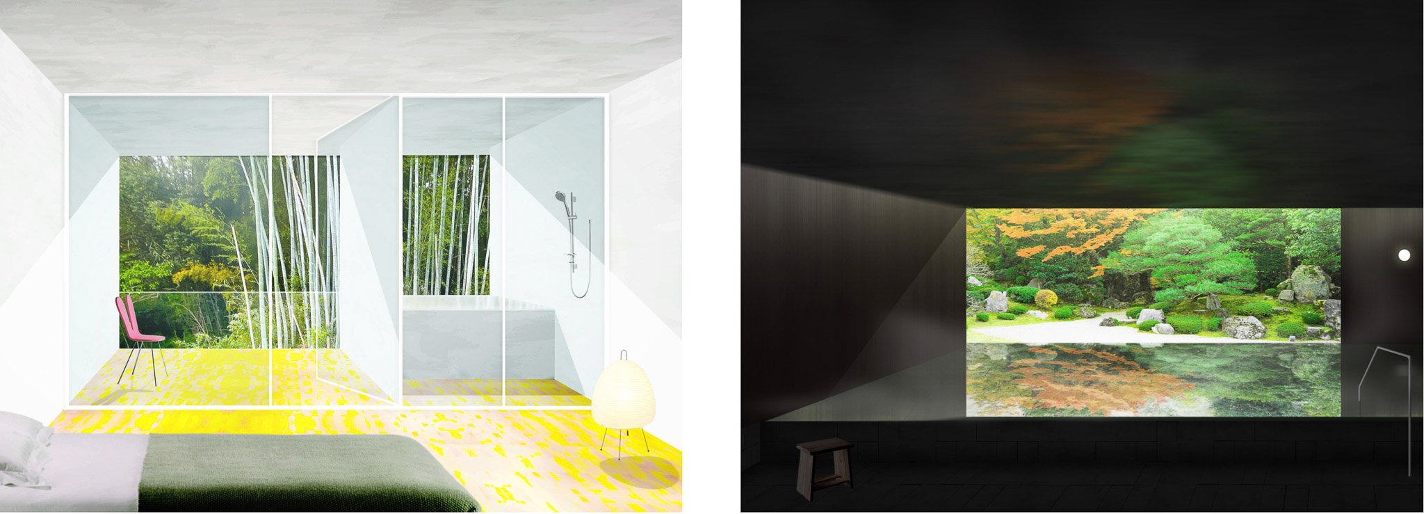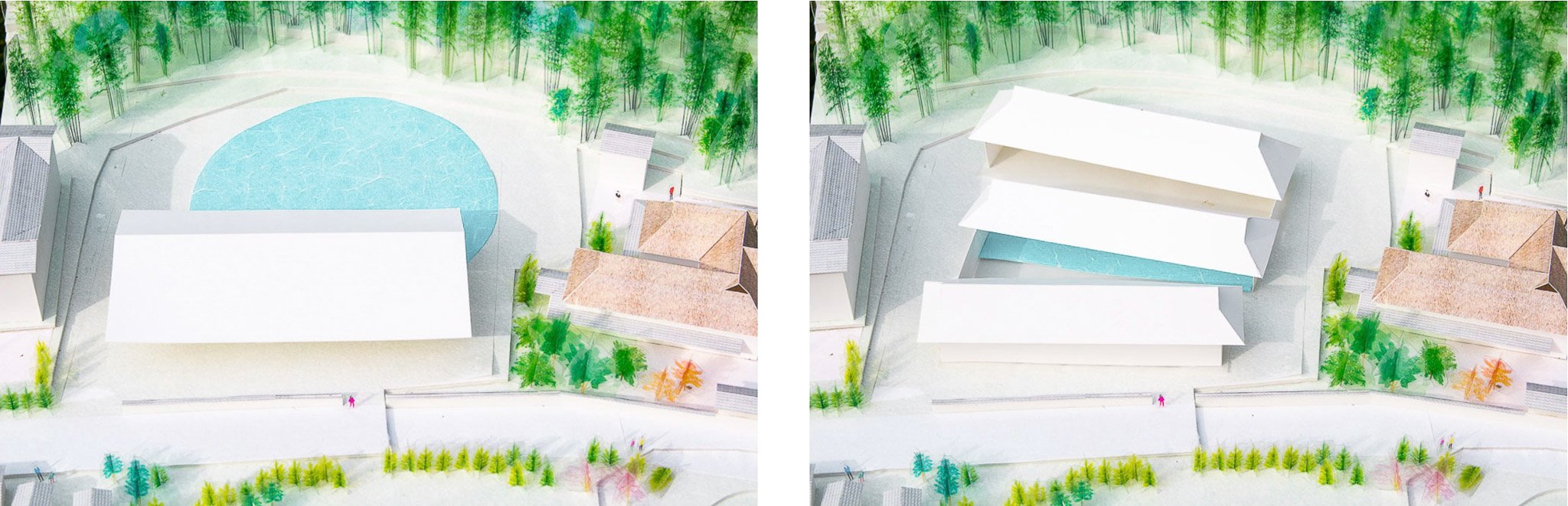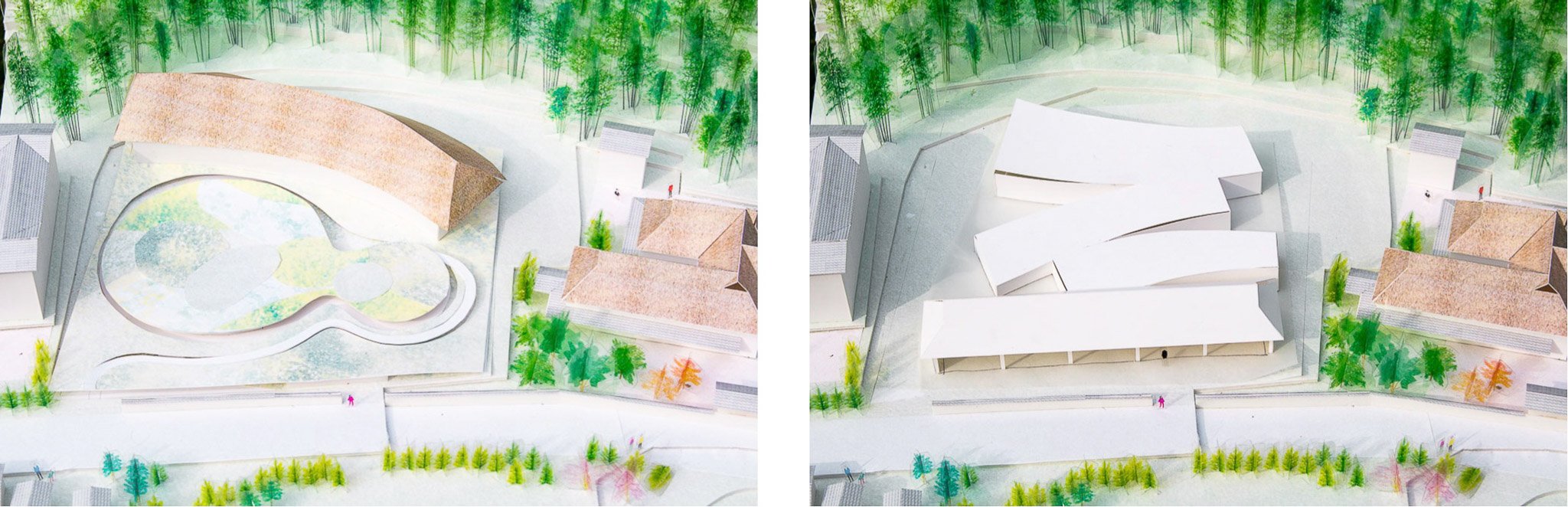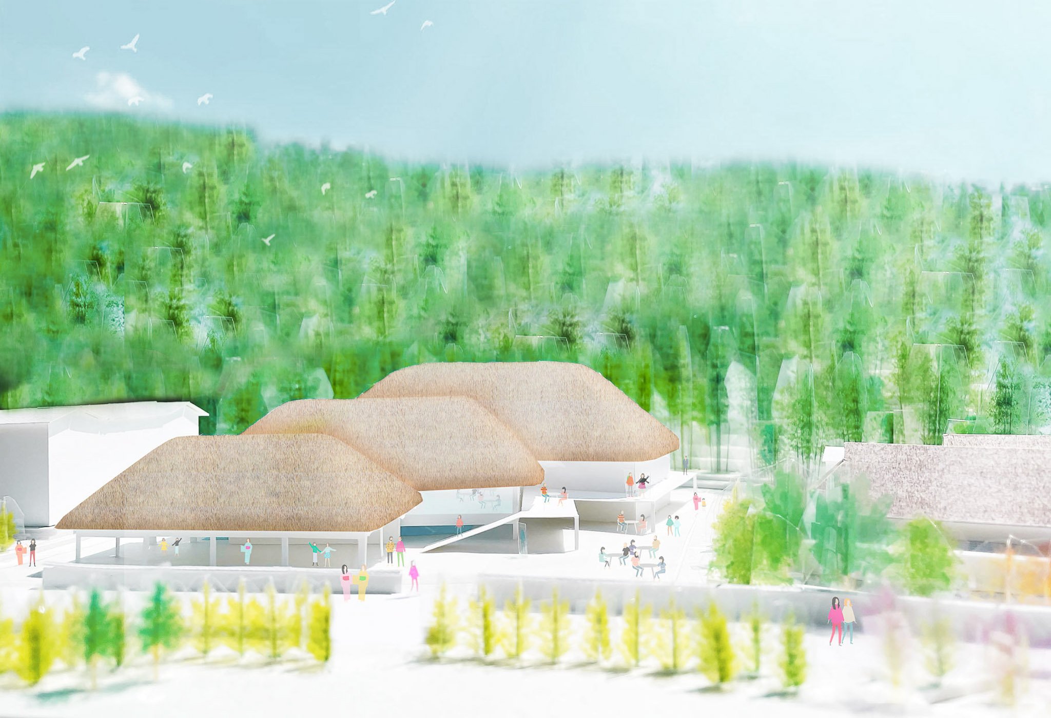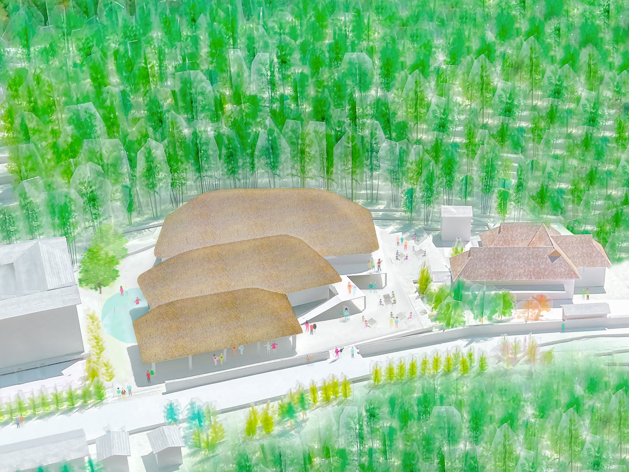 A hotel with 3 traditional “kayabuki” (straw) roofed buildings overlapping each other following the topography of the site and facing different directions. Each building is scaled and rotated to house its program (restaurant, hot spring, and hotel) offering various views and ambiances for its guests. The building backs on to a bamboo forest, while outdoor spaces surrounding the site include a large wooden terrace, outdoor hot springs, and Japanese gardens. Location: Akizuki, Japan Program: Hot Spring, Restaurant, Accommodation Completion: 2022- Floor area: 1,160 m2 / 360坪 Team: aki(architects)
