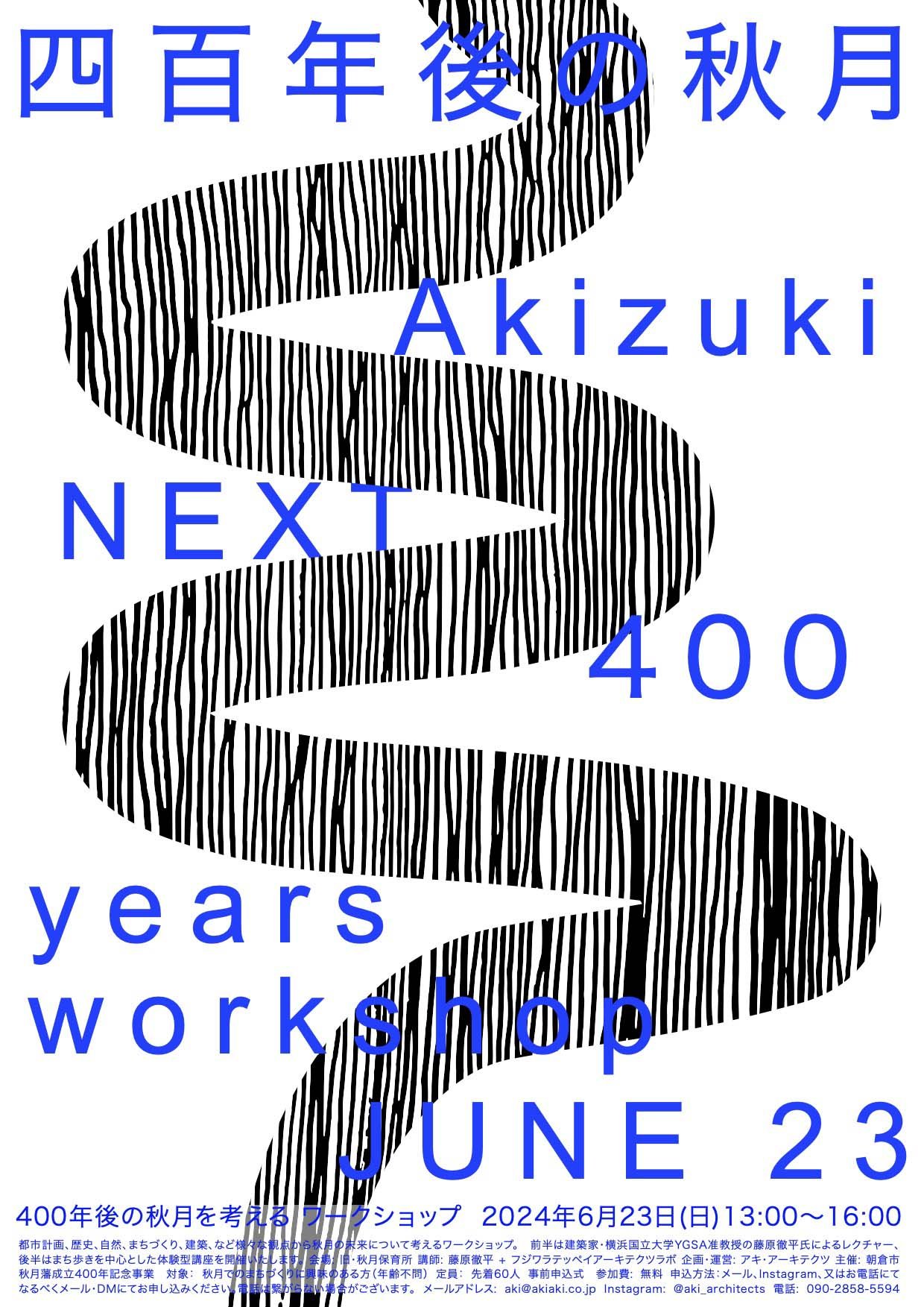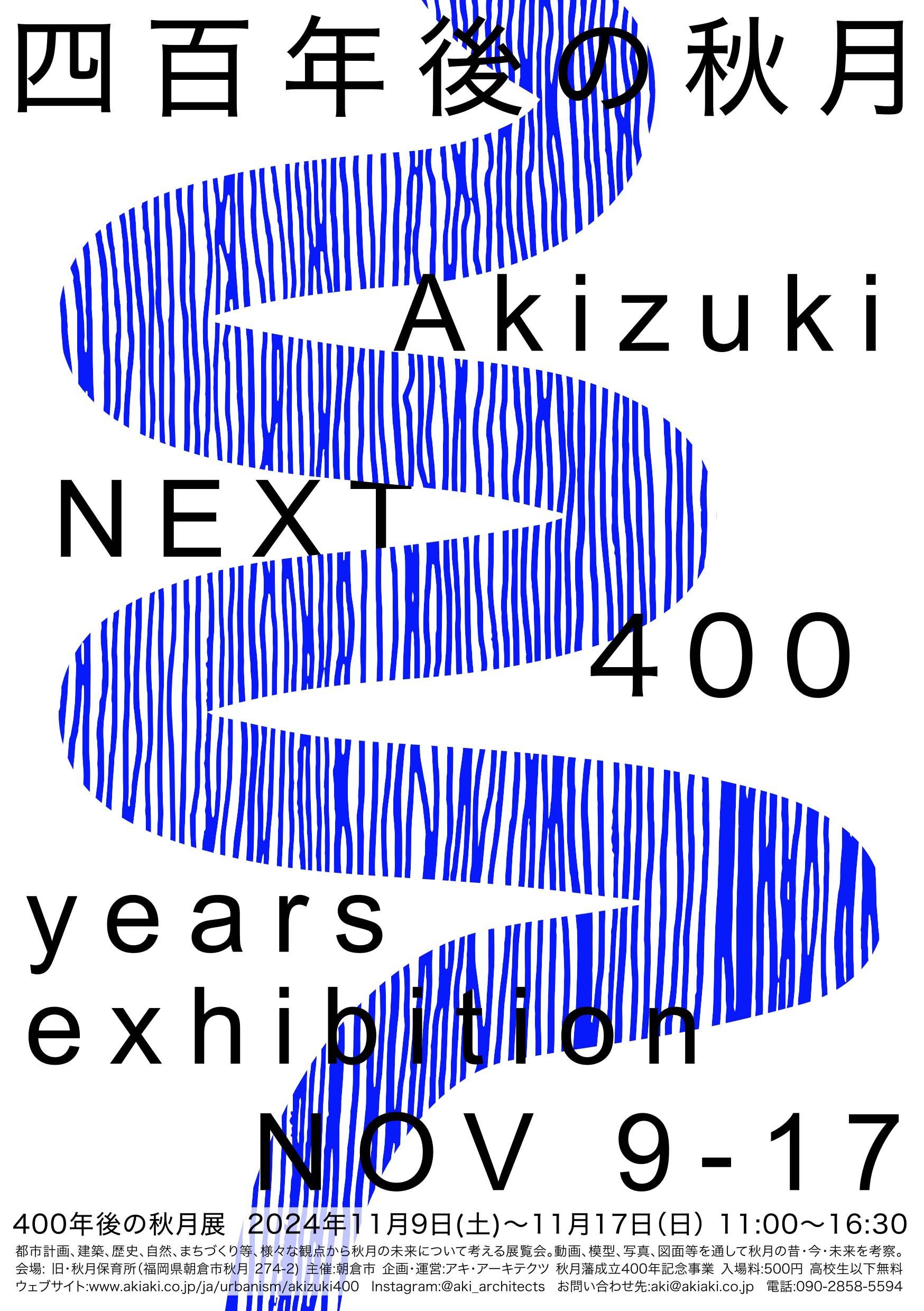 秋月藩が成立された400年前からの歴史を辿り、未来の秋月を考える展覧会。地図や図面、模型を通しての秋月の歴史、都市計画、建築、環境などを体験するだけでなく、職人、建築家、歴史研究家、大学教授、学生、住民などが一緒となり、ワークショップなどを通して考えた秋月の未来予想図を展開する。 主催: 朝倉市 企画 + 運営: アキ・アーキテクツ ワークショップ講師: 藤原徹平+フジワラテッペイアーキテクツラボ ドキュメンタリー制作: 藤田恵実 + 渡辺真太郎 写真: アキ・アーキテクツ